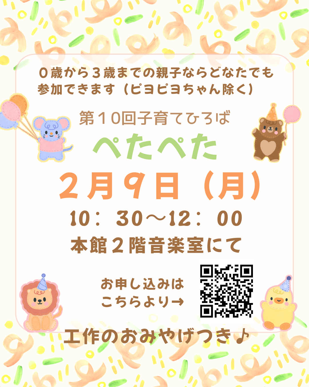 その他 ぺたぺた 2026年02月02日 子育てひろば【ぺたぺた】の開催 あたごはま幼稚園では月に一度、0歳から3歳を対象に親子で触れ合う【ぺたぺた】を開催しています。いよいよ今年度の最終回です。身体測定や手形をとって成長を一緒に喜びましょう♪参加ご希望の方はQRコードかお電話にてお申し込みください。